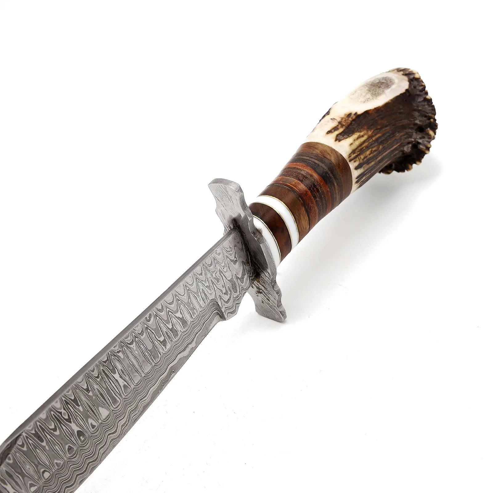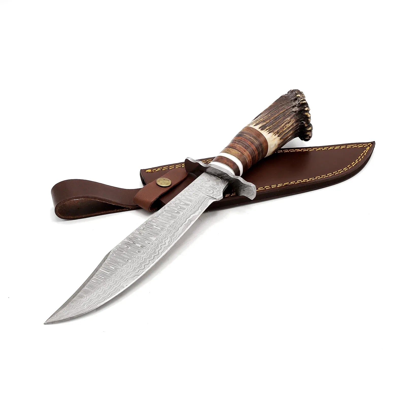 Rankenos medžiaga: Elnio ragas ir natūrali oda su Damasko plieno apsauga